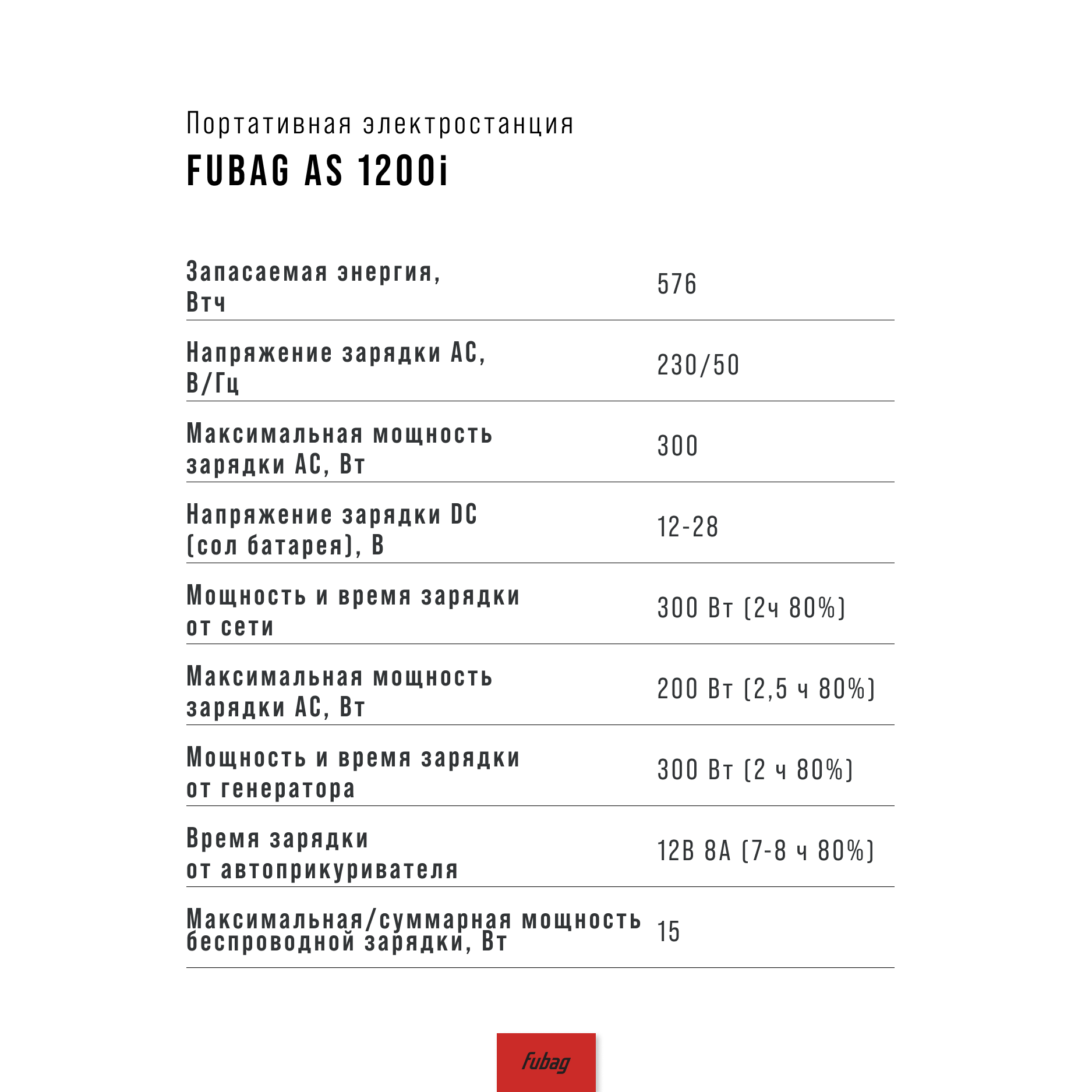 FUBAG AS 1200i — компактная и надёжная портативная электростанция на литий-железо-фосфатных (LiFePO4) батареях ёмкостью 576 Вт·ч. Она выдаёт 600 Вт номинальной мощности и выдерживает пиковую нагрузку до 1200 Вт. Благодаря чистой синусоидальной форме напряжения станция безопасна для чувствительной электроники, а вес всего 9,3 кг и удобная ручка делают её практичным спутником в дороге и на отдыхе.